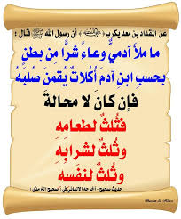 Le PROPHETE SIDNA MOHAMMED que le SALUT soit sur LUI, a déclaré: « Nulle personne n’a rempli un récipient plus dangereux que son estomac. Tandis que quelques bouchées suffisent à l’homme de survivre. Mais cependant, s’il ne peut se contenter de cela, qu’il réserve un tiers de son estomac pour les aliments, un autre tiers pour les boissons et le dernier tiers pour la respiration ! » [Tirmidhî, Zuhd, 47].