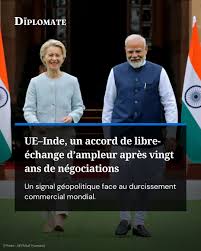 L’Inde et l’Union européenne (UE) ont officialisé Mardi 27 Janvier 2026, au cœur de la capitale Indienne, New Delhi la conclusion d’un ambitieux accord de libre-échange qui, au terme de 20 ans de négociations, va créer une zone de libre-échange de 2 Milliards de consommateurs. Ce pacte a été paraphé en présence du Premier Ministre Indien Narendra Modi, de la présidente de la Commission européenne Ursula von der Leyen et du président du Conseil Européen Antonio Costa.